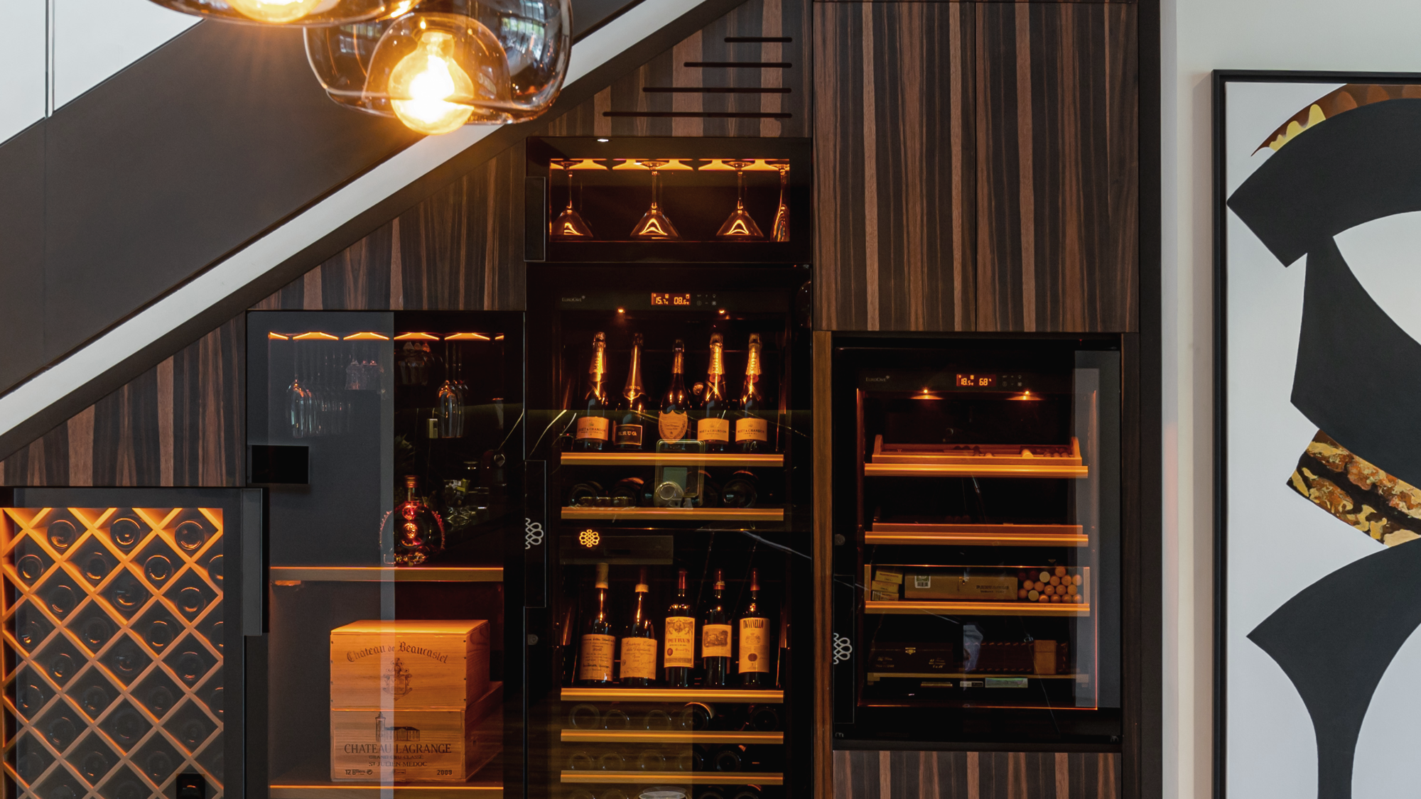 A dual-zoned Eurocave wine storage and cigar humidor is on display in the living area. These storage units are used to safeguard the owner’s private collection, however access may be granted under the supervision of the property manager. A wide selection of glassware is available to the guests.